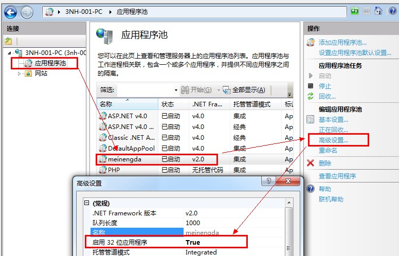 2、應(yīng)用進(jìn)程池--選定你網(wǎng)站所使用的進(jìn)程池--高級設(shè)置--應(yīng)用32位應(yīng)用程序--true
